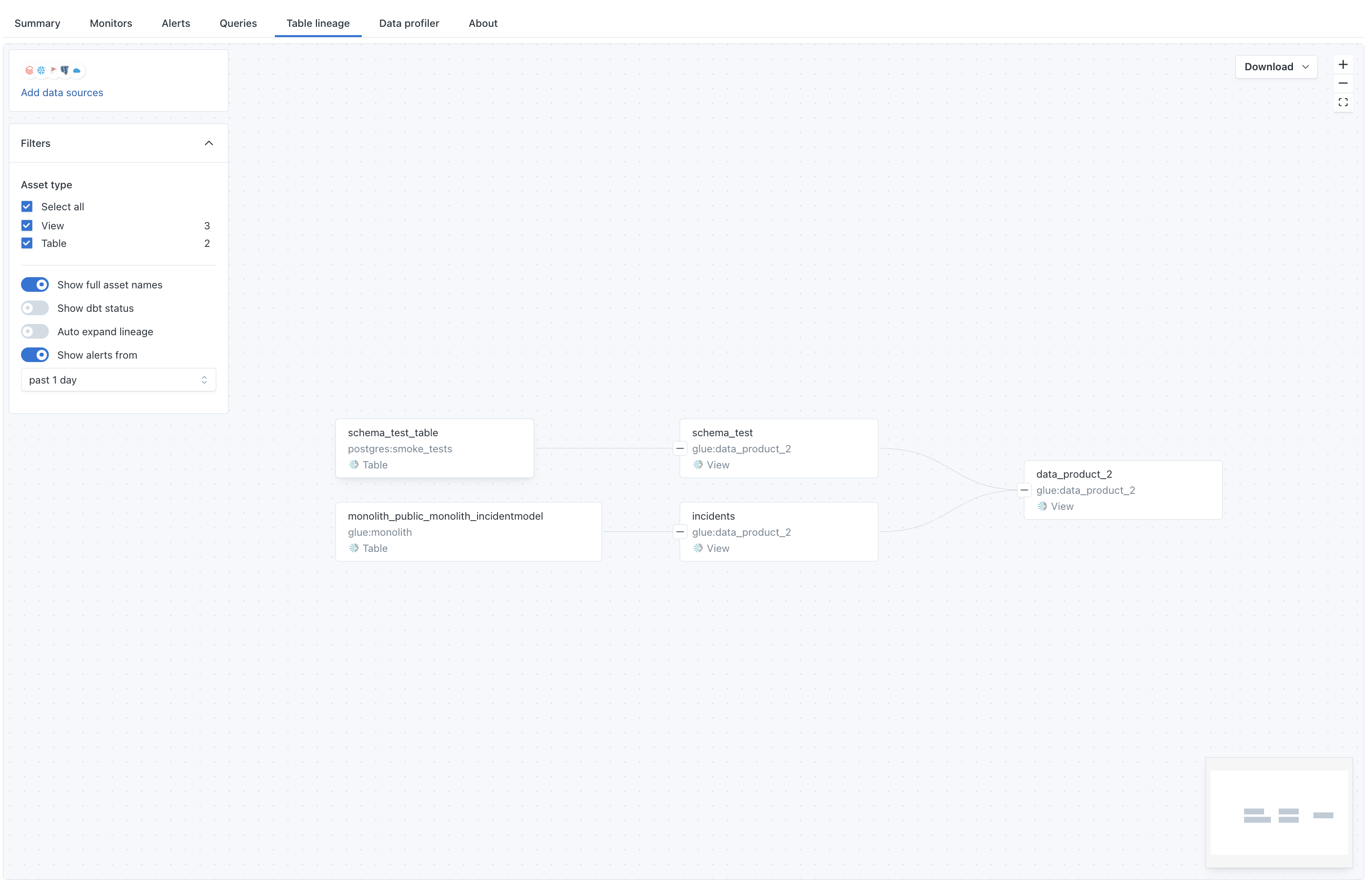 Here's an example of Data Product lineage in Monte Carlo. Notice how they are labeled as views.