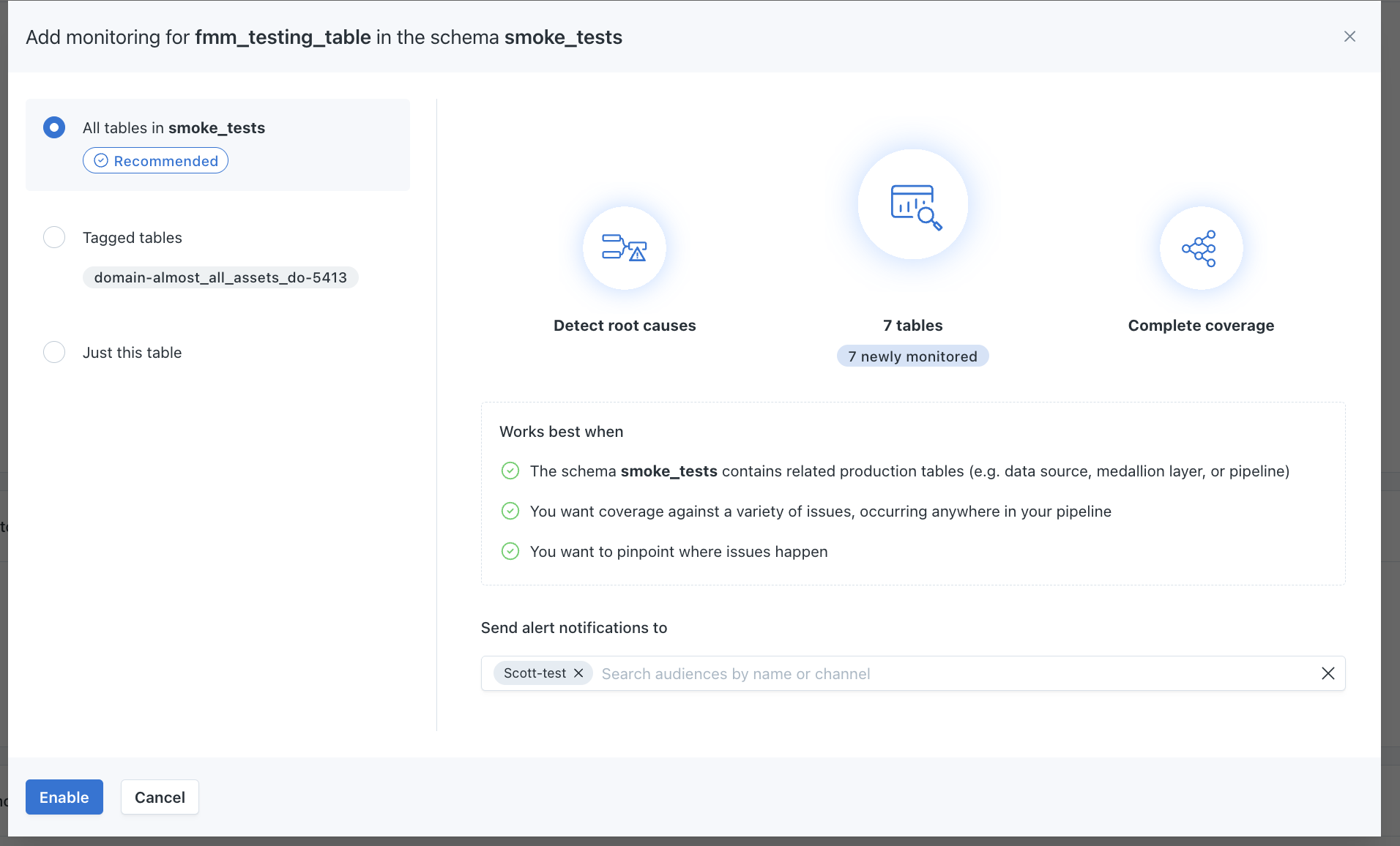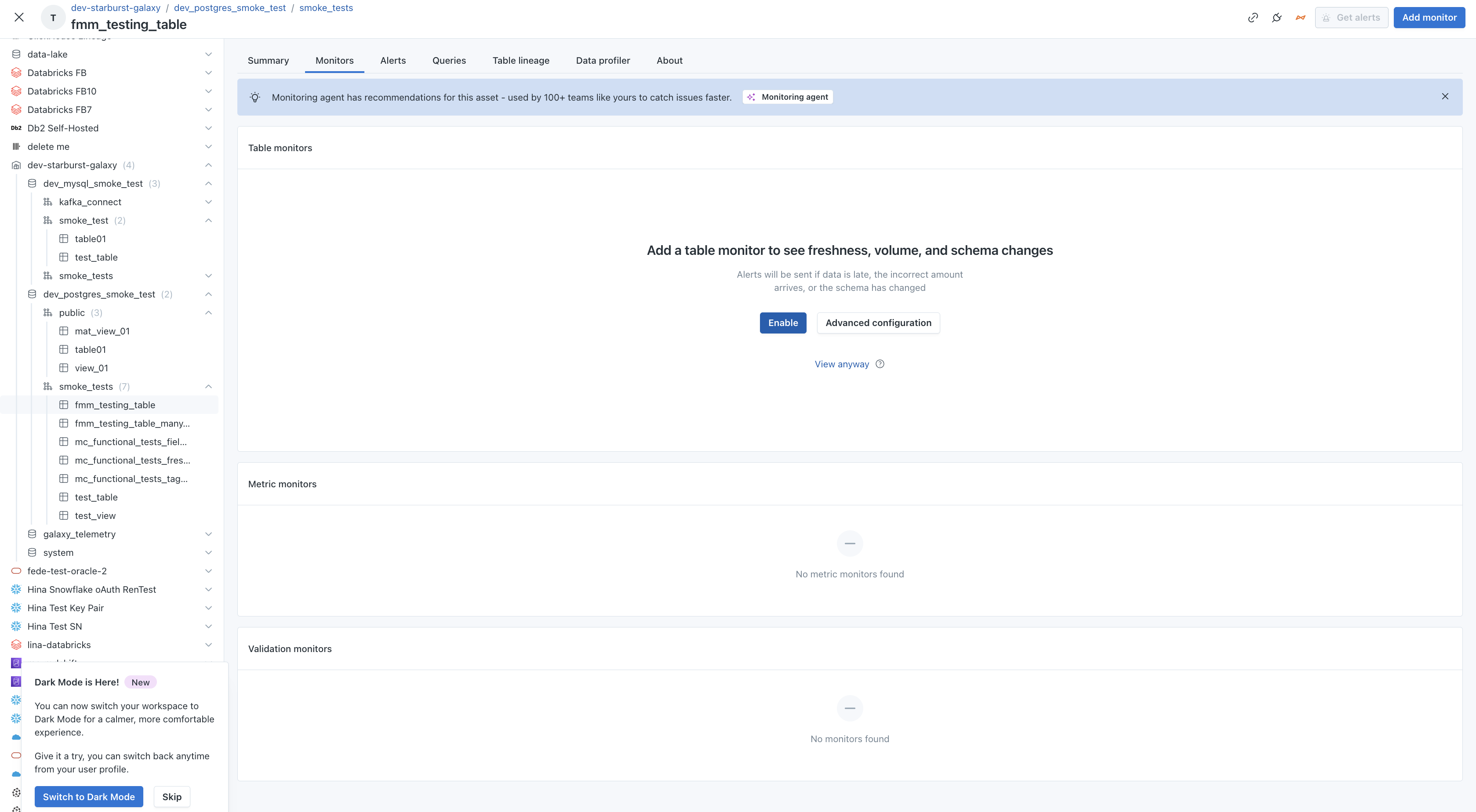 - To enable row count and freshness monitoring on a given table, click the Enable row count monitoring button on the table summary page