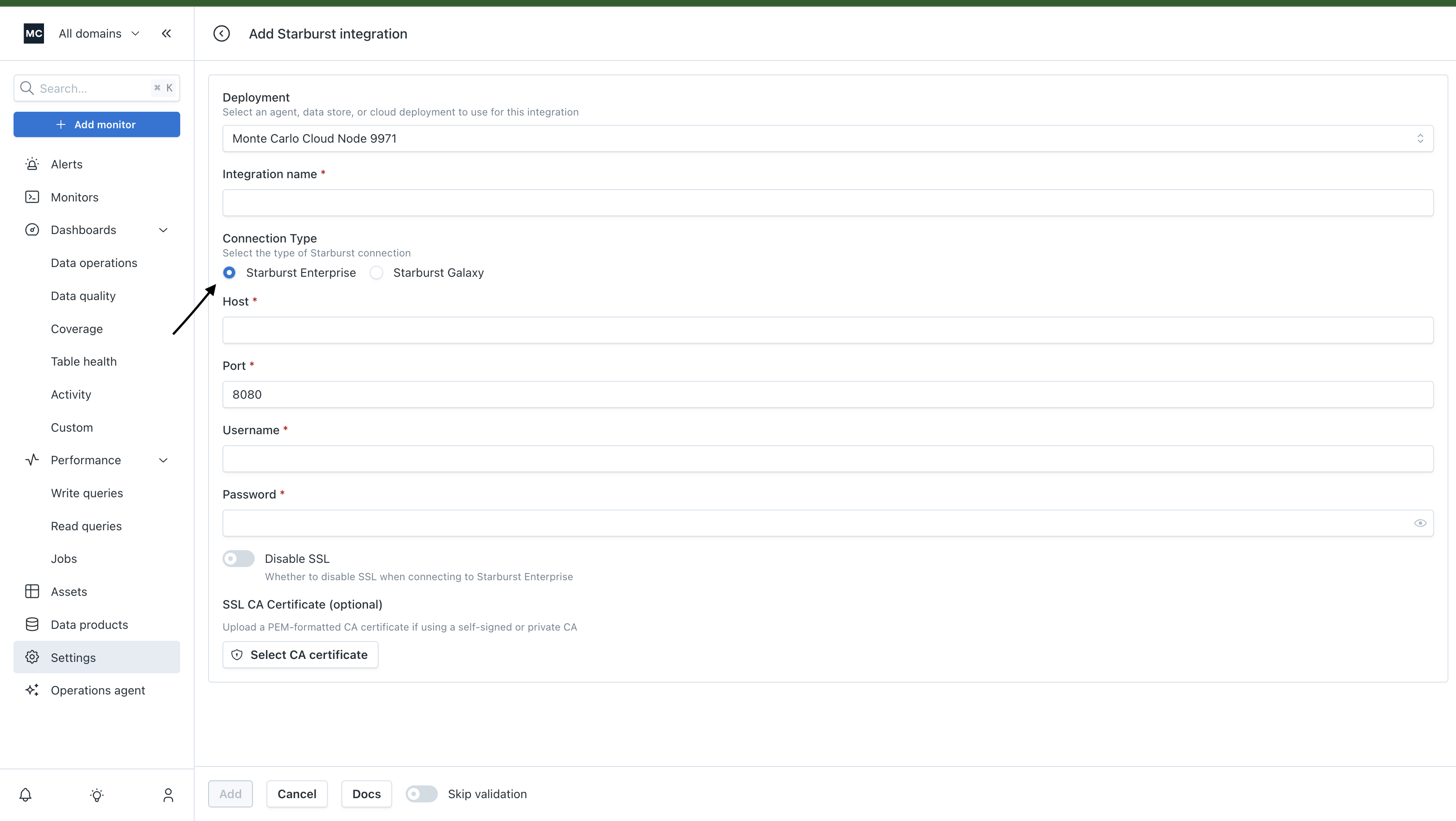 You can add the Starburst integration using the Monte Carlo UI or CLI.