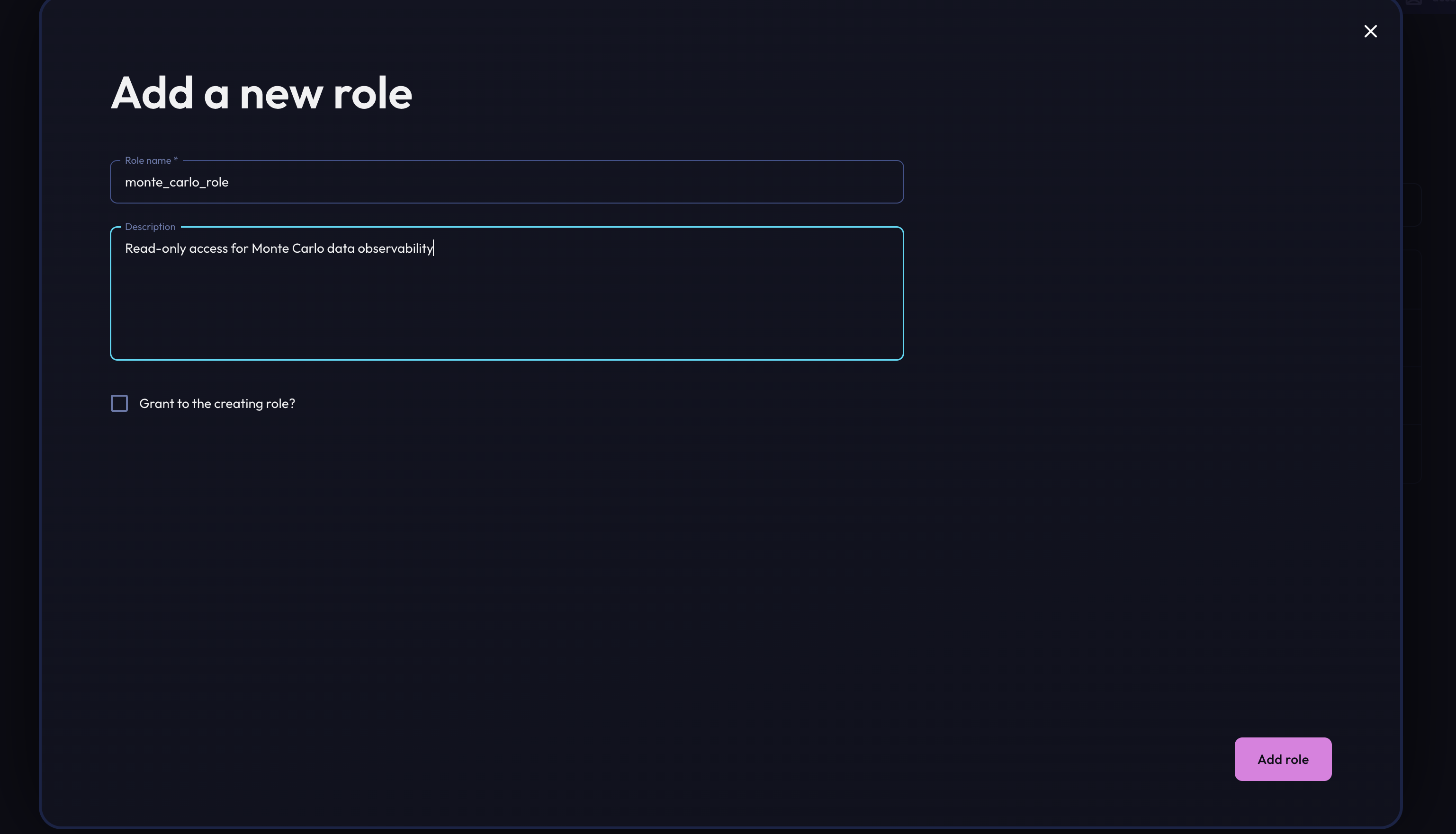 monte_carlo_role) - Add a description (e.g., "Read-only access for Monte Carlo data observability")