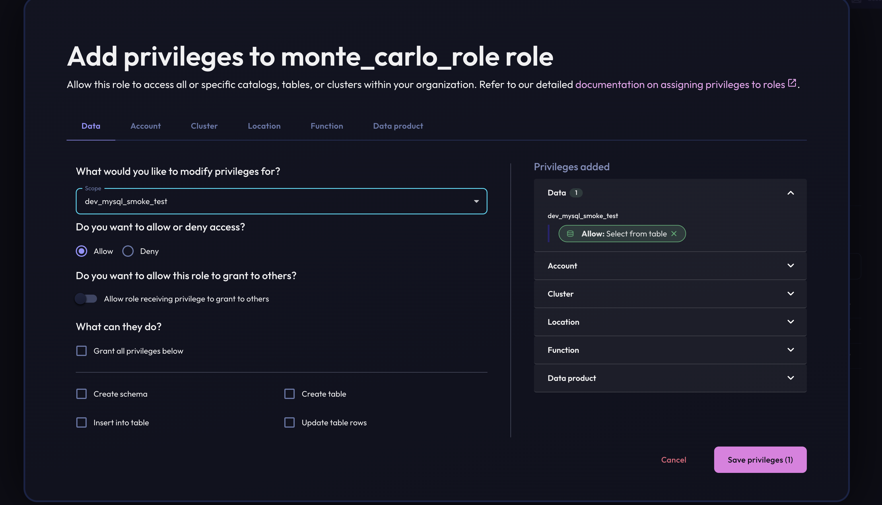 - For each catalog you want Monte Carlo to monitor, add the following privileges: