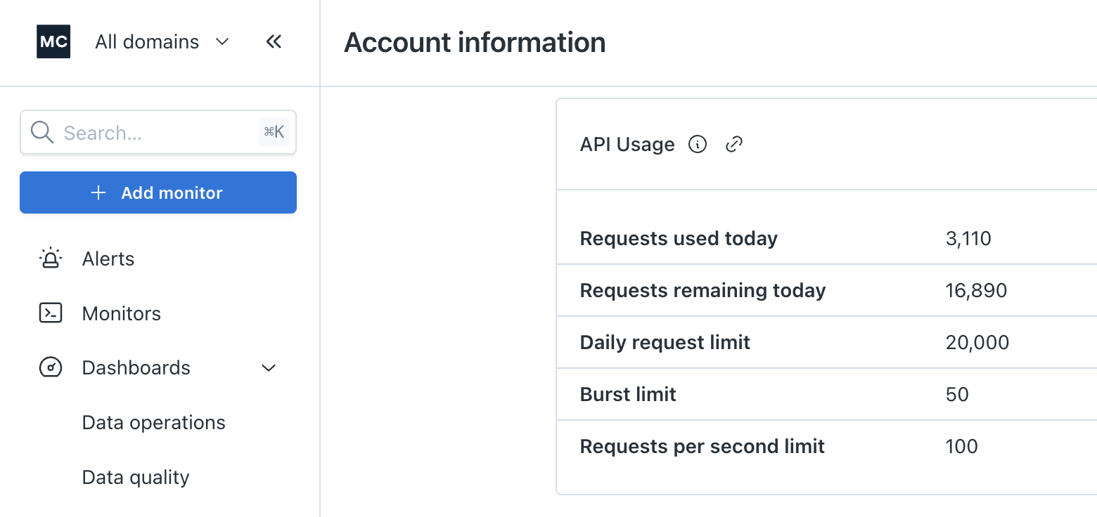 You can view your API usage and limits within Monte Carlo by visiting the Account Information page. Your usage resets daily at UTC midnight.