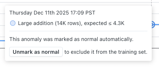 To prevent repeated alerts, monitors are designed to recognize when a pattern that first appeared unusual is actually normal for your data. If the same type of anomaly occurs frequently enough, Monte Carlo may learn that this behavior is expected and automatically incorporate it into the normal baseline. When this happens, the alert threshold widens so the monitor no longer triggers on that recurring pattern. If this adjustment isn’t desired, you can revert it by unmarking the anomaly as normal to exclude it from training.